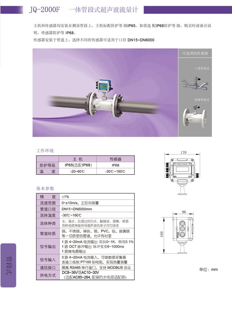 管段式超声波流量计由主机和管段式传感器组成。 DN15-32采用π型管段式传感器,DN40及以上采用标准型管段式传感器。 管段式超声波流量计具有安装简单,始动流量低,测量精度高,无压力损失等优点。